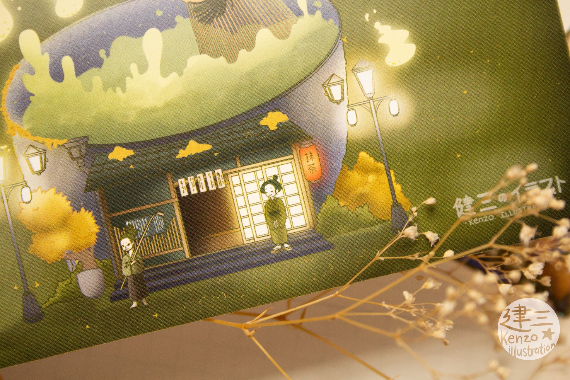 Centuries ago, a wandering samurai gets lost along his travels and stumbles into a dark forest. It was then, he stumbled across a little green spirit that showed him the way to the exit. Hours later, the samurai had come out of the forest only to find house made from the remains of a giant ceremonial green tea mixing bowl. The doors of the house open to reveal a friendly matcha witch who communicated with the green tea spirits. The spirit showed him the way into the house and together with the witch, they enjoyed a cozy evening drinking tea and telling stories.